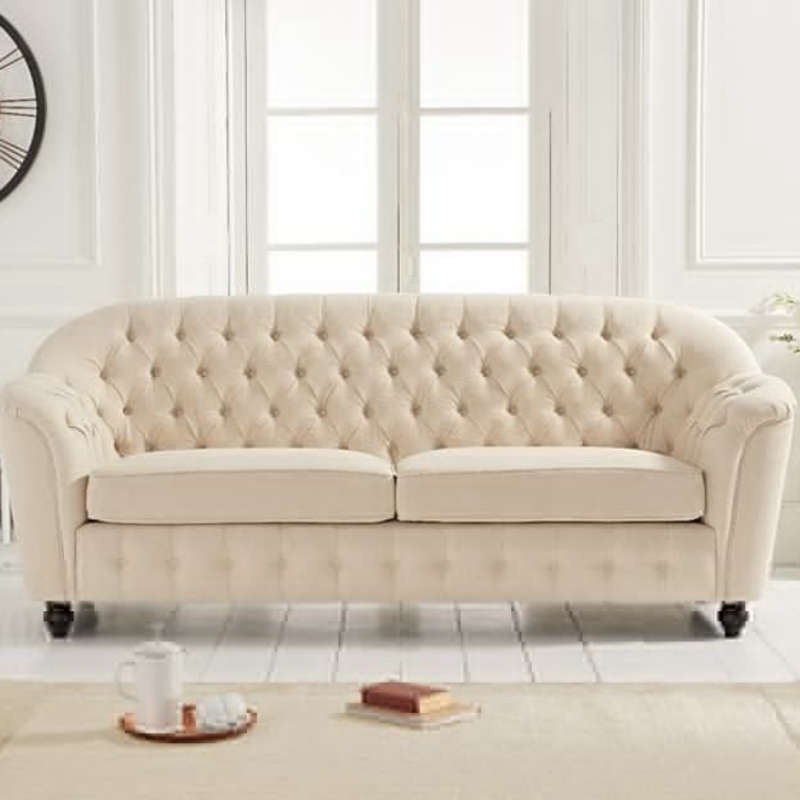 Classic, stylish, welcoming, charming, are just a few of the wonderful words used to describe this beautiful Carrie 3 seater beige linen sofa. Featuring a deep filled seat cushion for optimal comfort, buttoned detail, dark wood bun feet and the Chesterfield charm, that will give any room a wonderful homely feel.
