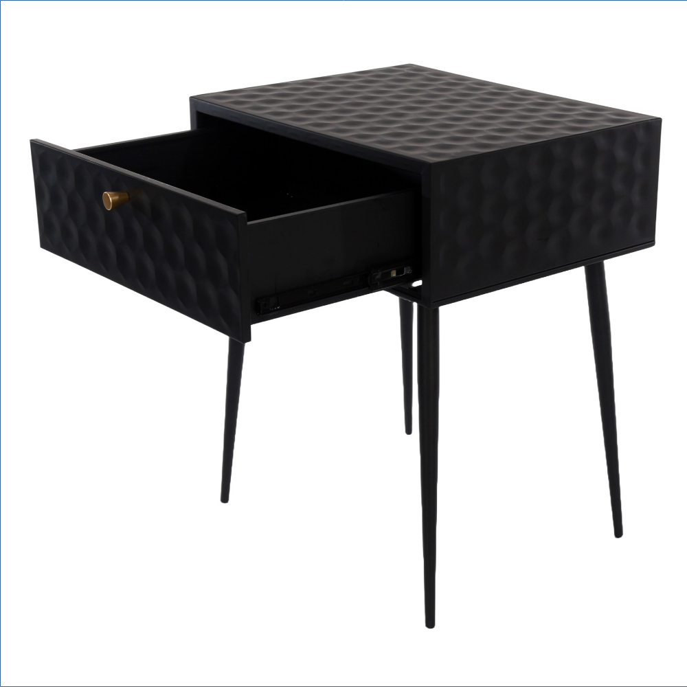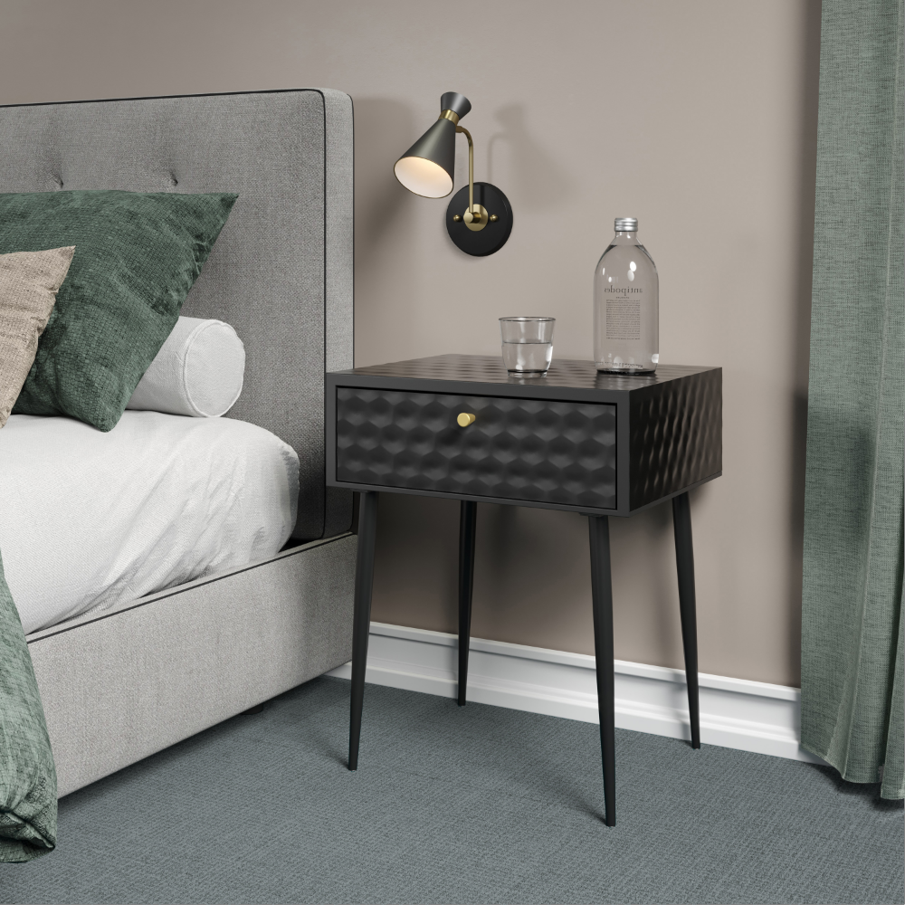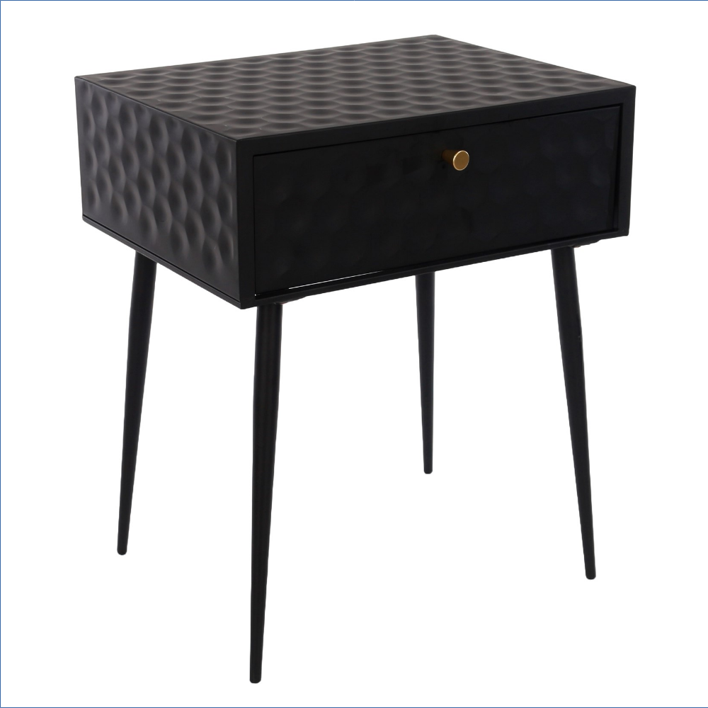 Durable, robust, and elegant. This bedside cabinet, crafted entirely from metal and coated in sleek black paint, is accented by a contrasting gold-effect handle that makes a bold statement. The drawer unit showcases a honeycomb pattern pressed into the panels, creating a captivating three-dimensional texture. The drawer front mirrors this design, complemented by a gold-colored handle. Inside, the drawer box is also metal with a painted finish and smooth-glide metal runners for effortless use. The piece is elevated on Mid-Century inspired tapered metal legs, making cleaning underneath simple. Perfect as a bedside or side table, it combines style and practicality seamlessly.