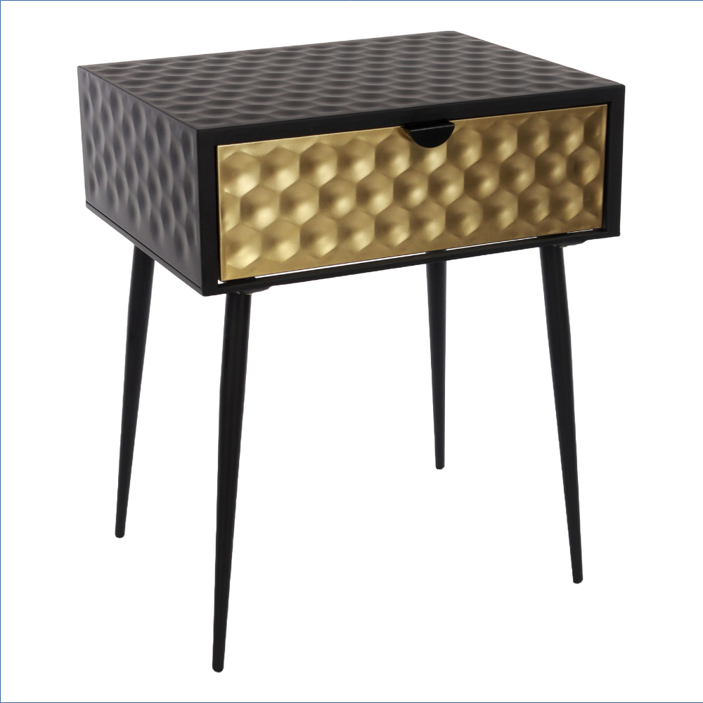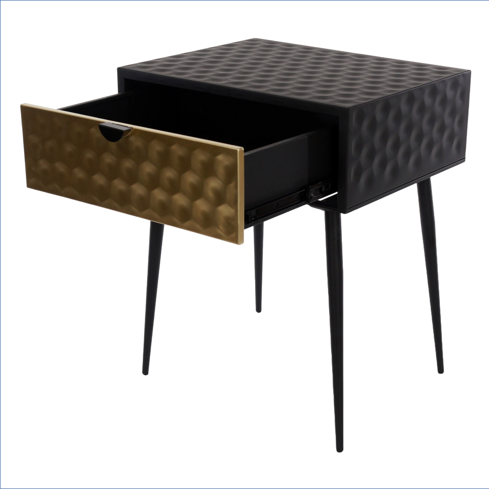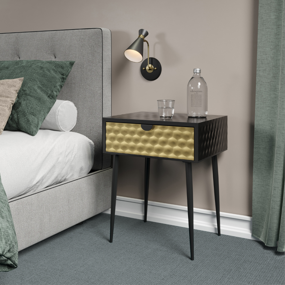 Durable, robust, and effortlessly stylish. This bedside cabinet is crafted entirely from metal and coated in sleek black paint, accented by a striking gold-effect drawer front. The drawer showcases a pressed honeycomb pattern, adding a captivating three-dimensional texture, while the front features the same design complemented by a black handle. Inside, the drawer box is also metal with a painted finish, equipped with smooth-glide metal runners for easy access. The design is finished with Mid-Century-inspired tapered metal legs, making it the perfect choice as a bedside or side table.