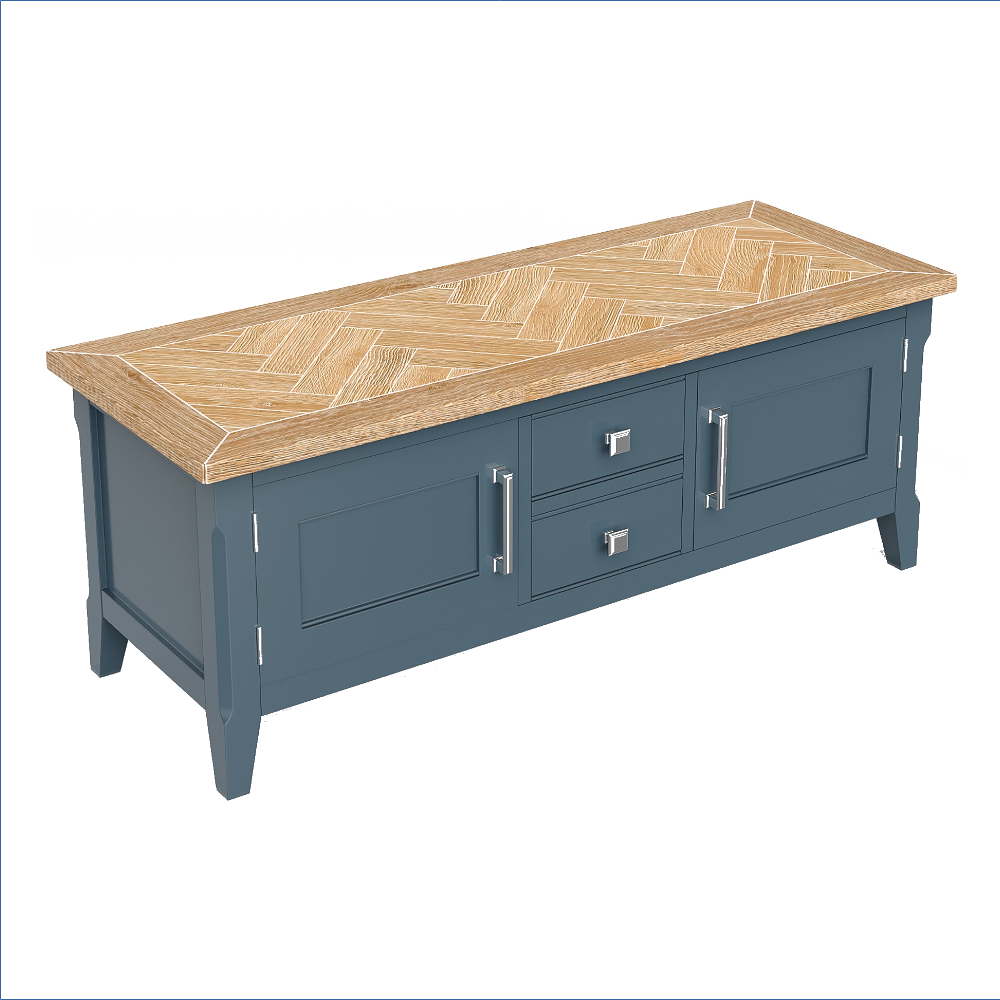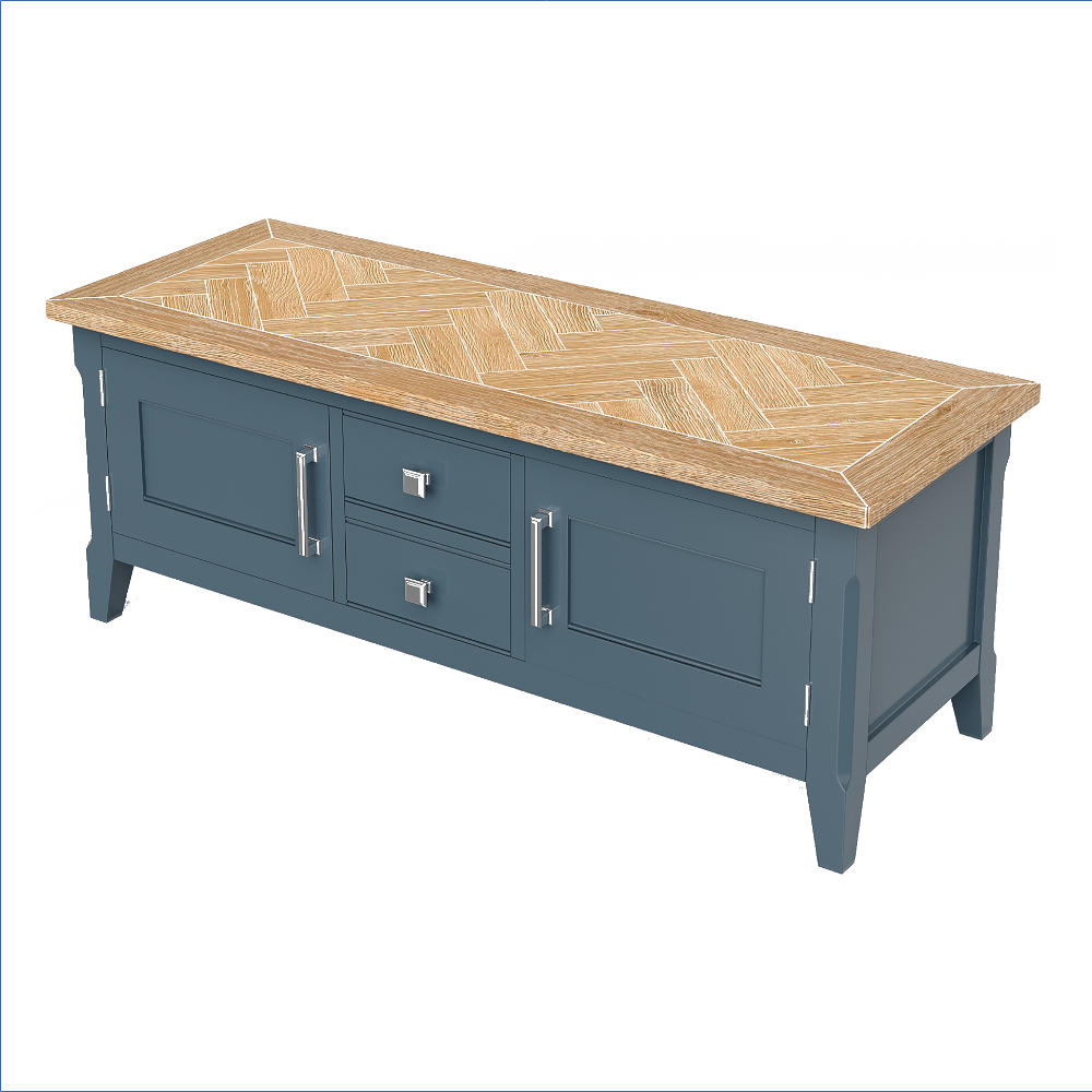 This stunning TV unit features a rich blue frame that beautifully contrasts with the delicately distressed oak parquet top, creating a striking focal point in any room. The meticulous hand-finishing process ensures that each piece is unique, showcasing the craftsmanship that goes into every detail. With two spacious drawers and two cupboards, each equipped with a shelf, this unit offers ample storage for your media essentials while maintaining a sleek and sophisticated appearance. The resilient clear lacquer finish not only enhances the beauty of the wood but also provides a durable surface that withstands the test of time.
