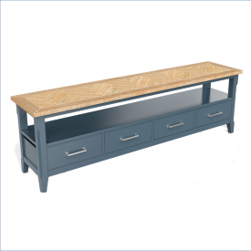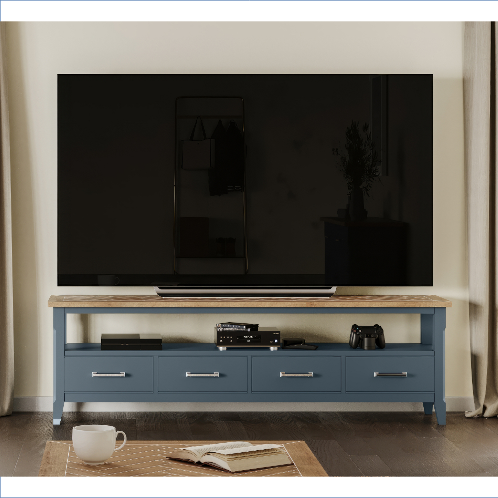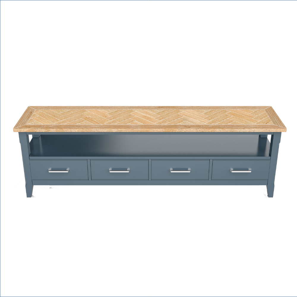 Crafted with meticulous attention to detail, this large TV unit features a beautifully hand-finished oak parquet top that has been delicately distressed to enhance its natural beauty. The rich blue paint that coats the rest of the unit adds luxury sheen, making it a perfect centerpiece for any room. Designed to accommodate televisions with screens up to 90 inches, it combines functionality with elegance, ensuring your entertainment setup looks as good as it performs.