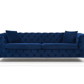 The Alegra 3 seater sofa in blue plush fabric oozes style and sophistication. This sofa would make an excellent statement piece for any living area and help accentuate other colours in the room. The blue plush fabric is soft and sumptuous, and the colour complements the Chesterfield design of the sofa, with the deep buttoned back and contemporary metal legs. The seat cushions are made using a high density foam for maximum comfort and longevity. The Alegra sofa is available in grey and green plush fabric also, and this 3 seater comes with 3 free scatter cushions.