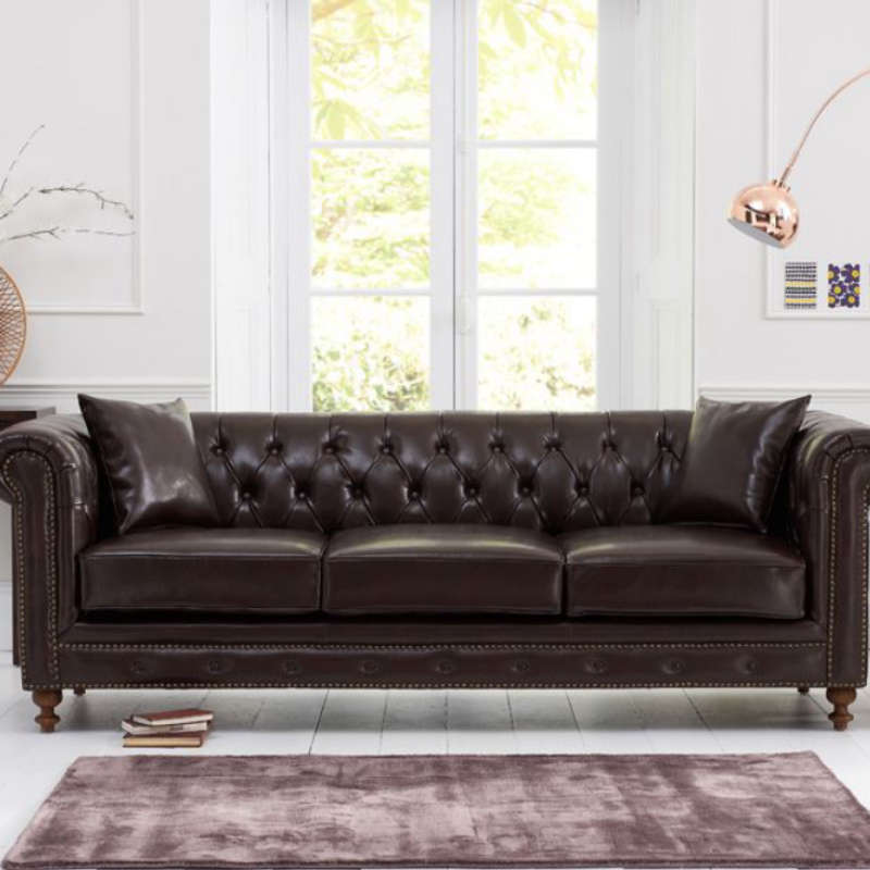 A stunning blend of elegant traditional style and modern craftsmanship, the Montrose 3 seater sofa makes a stunning addition to any living room. Built to the highest standards this large sofa is stylish, comfortable and durable. With a classic Chesterfield design, it has been finished in smooth rich brown leather complete with foam filled seat cushions and aerated upholstery to allow the leather to breathe. Perfectly complemented by a deep buttoned backrest and refined metal detailing, the beautiful dark ash legs are the perfect finishing touch. With two free cushions.
