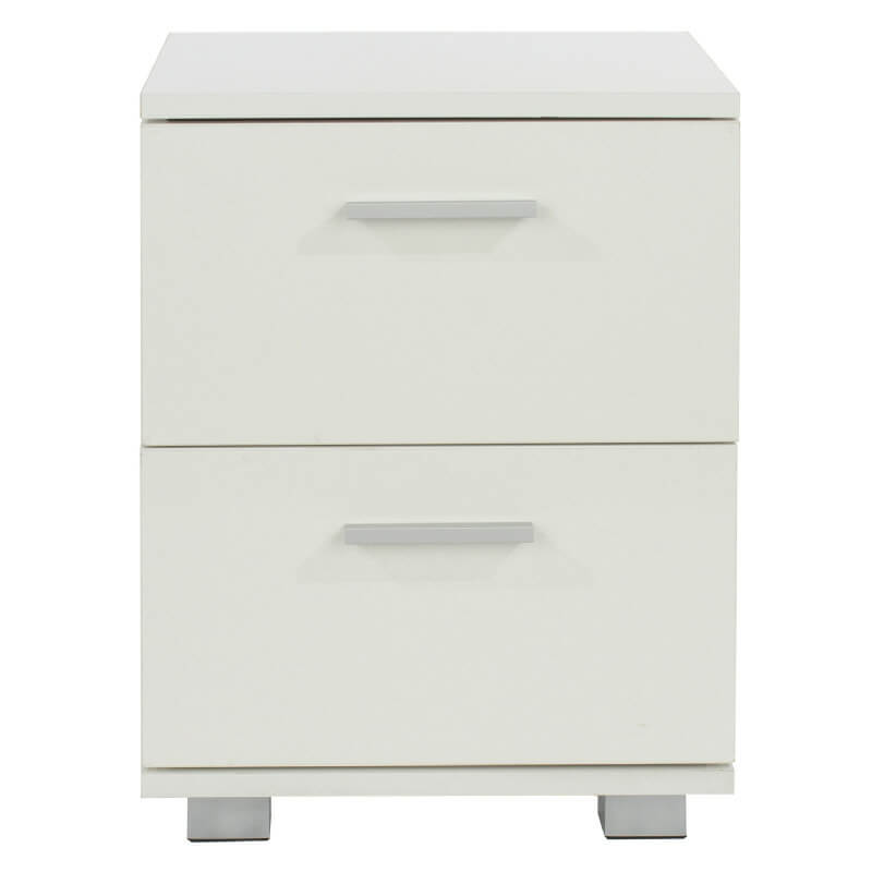 A striking 2 drawer bedside unit, it has a smooth gloss white finish, with silver handles and feet. It’s easy on the eye, and easy to clean too. The large handles and drawer runners are metal for long term reliability and there’s a large range of other pieces in the range to complete the set.