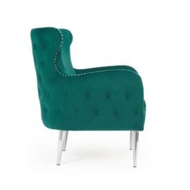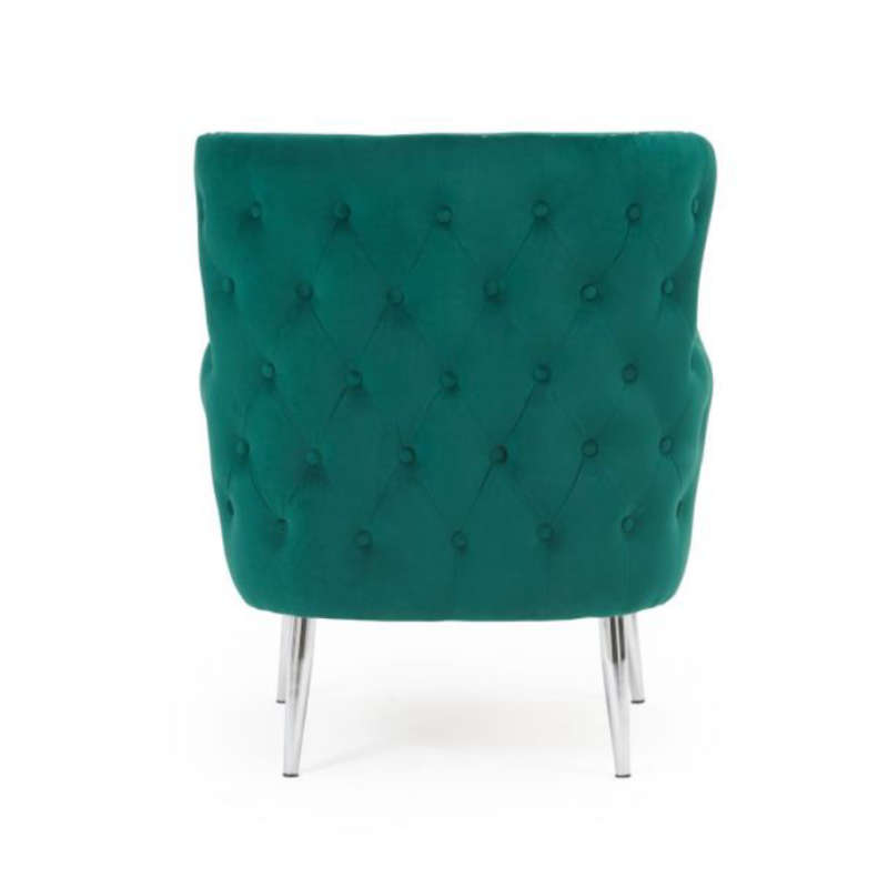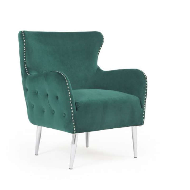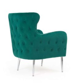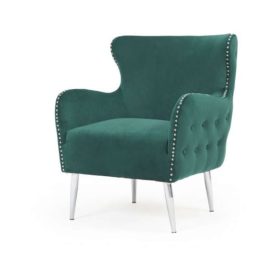The Bina green velvet accent chair brings olde-world elegance and sophistication to any living area. Featuring a curved back and classic winged design, the accent chair is upholstered in rich green velvet and features charming tufted button detailing on the sides with metal studs along the edges. Complete with comfortable foam padding, the Bina accent chair is supported by elegantly tapered metal legs.