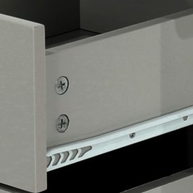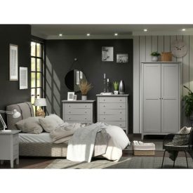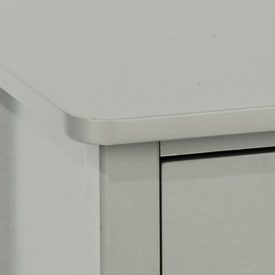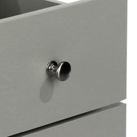 A neat 2 drawer bedside cabinet, with rounded corners and edges in a modern shaker style. Finished in a water-based grey paint, it has a soft matt finish and is complemented by bright metal knobs.