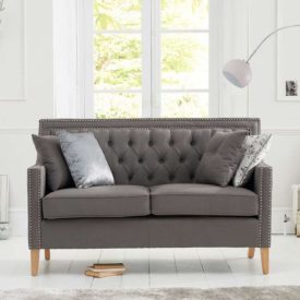 Offering chic elegant style and comfort the Casa Bella chesterfield-style grey fabric sofa comfortably seats two people. The sofa effortlessly adds a look and feel of opulence to any living room setting. Charming and full of character, the sofa is upholstered in smooth grey fabric and features deep buttoned backrest, metal stud detailing around the edges and foam filled seat cushions. Completing the sofa are natural ash legs in a traditional tapered shape. Comes complete with two free cushions