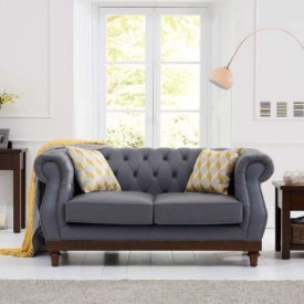 Our Highgrove grey leather 2 seat sofa adds a touch of timeless design and luxury to your living room. Beautifully crafted with style and comfort perfectly balanced, this chic grey sofa instantly enhances any home. Upholstered in smooth grey leather, it has a sophisticated look and features elegant curves and deep button detailing. Comfortably seating two people, the vintage style sofa is complete with foam filled seat cushions, metal stud detailing and a dark ash base with elegant turned legs.