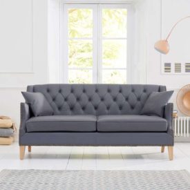 Classically elegant, it is upholstered in smooth grey leather and features foam filled seat cushions and a vintage style deep button design. Complete with metal stud detailing, the sofa is supported by tapered solid ash legs.