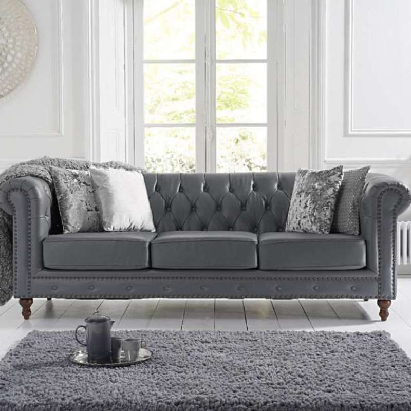Chic and statement-making, this Montrose 3 seater sofa features a versatile grey shade, and a luxe, smooth leather fabrication. Boasting classic Chesterfield styling with its deeply buttoned backrest and softly scrolled arms, it’s modernised with contemporary, tonal metal-studded trims. Wide foam-filled leather cushioned seats make for a roomier size for the whole family, with two free fabric scatter cushions provided for style and comfort, all supported by low-rise, sturdy ash-toned oak legs.