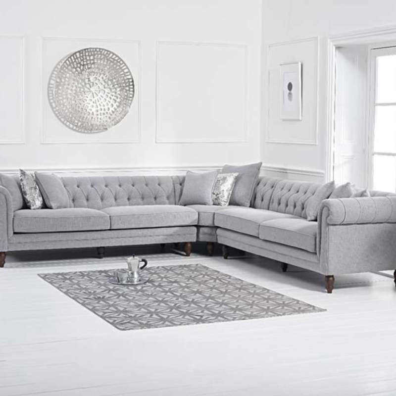 Comfortably seating 5 people, this gorgeous corner sofa features a light grey linen fabric covering, and a combination of traditional Chesterfield-inspired features. With tufted-button design detailing to the elegantly scrolled arms and sturdy solid wood feet in a dark stain. Designed in a corner shape for versatile, full family friendly and space-saving styling. Includes seven 40 cm square matching scatter cushions.