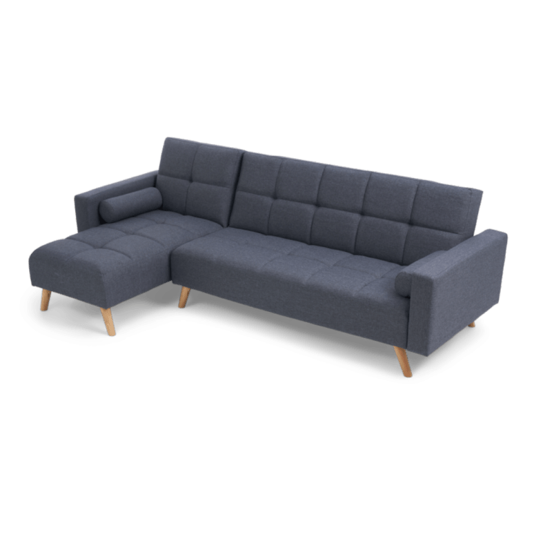 Modern and durable, our Abigail sofa bed makes a stunning impression in your living room. Upholstered in smooth grey linen, the left hand facing chaise layout complements any décor. It features a deep buttoned design and dense padding for the ultimate comfort, easily turning into a guest bed via an integrated mechanism in the seat back. It’s supported by tapered light oak legs.