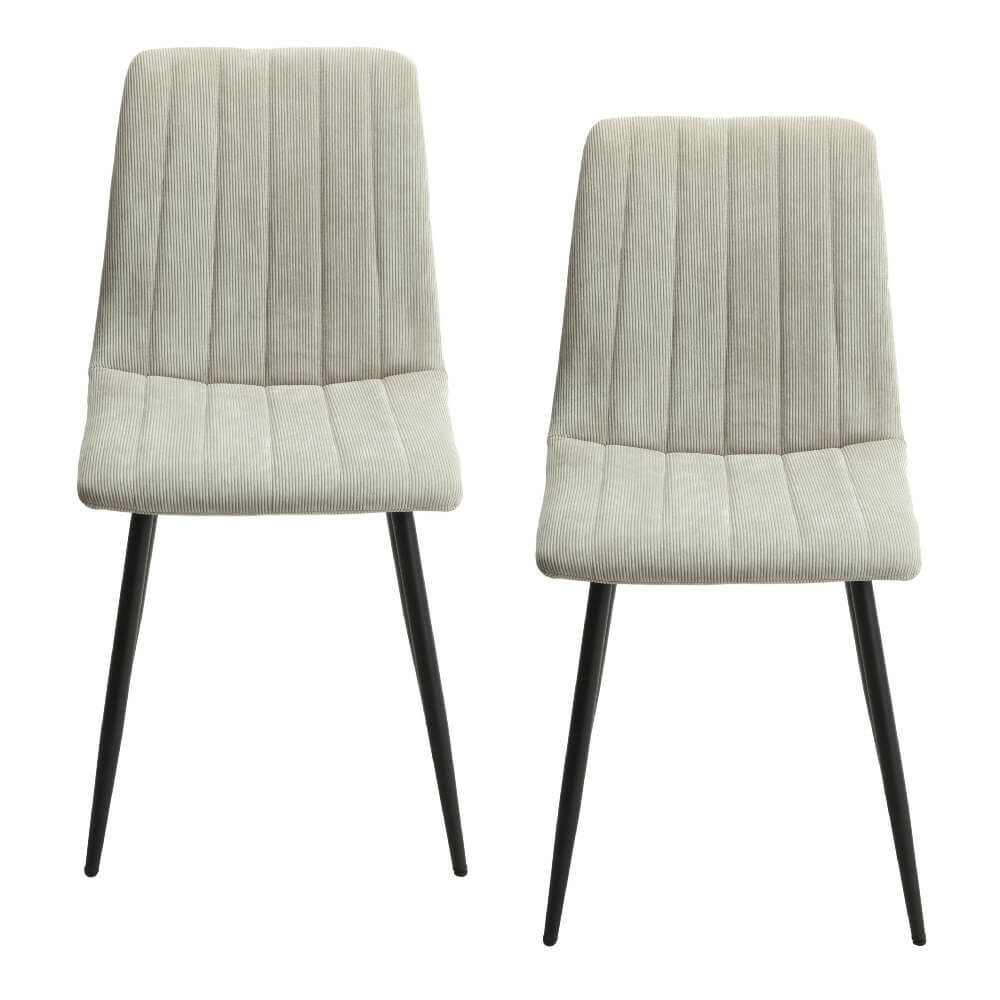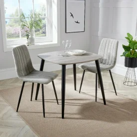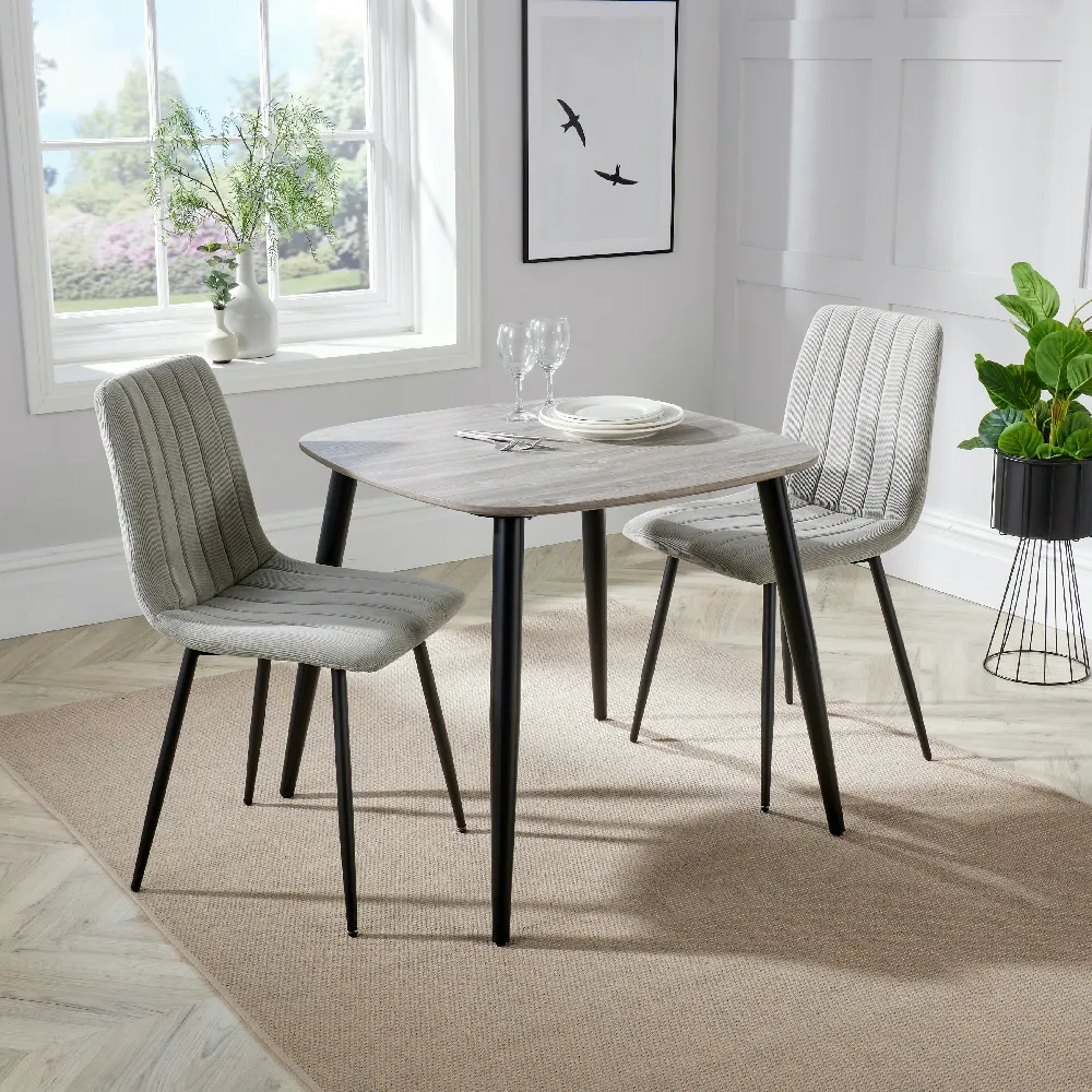 Enhance your dining experience with this stylish 2-seater dining set. It features a square table with a grey-oak effect top and sleek black tapered legs, perfectly complementing the modern aesthetic of any room. The set includes two upholstered chairs in light grey fabric, showcasing a chic vertical stitch pattern that adds a touch of elegance. Designed for small spaces, these compact chairs offer both comfort and practicality. The plastic injection moulded frame ensures durability, while the soft foam filling provides a cosy seating experience. This dining set is ideal for intimate meals or casual gatherings, making it a perfect addition to your home.