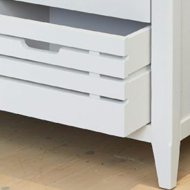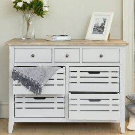 A compact sideboard or servery with a wonderfully unique design. There’s four roomy crate-style drawers, with two medium and one smaller drawer providing extra space at the top.