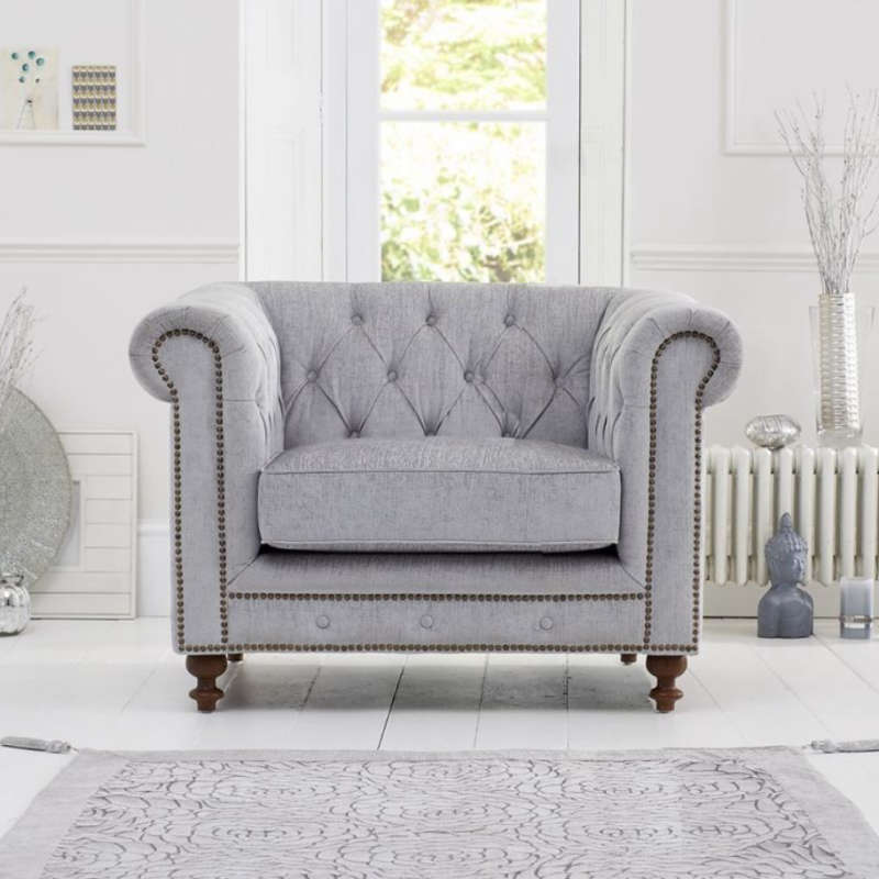 The Montrose Chesterfield-style grey fabric armchair brings elegance, charm and sophistication to any living room or library. With the matching 3 seater and 2 seater in this range, you can have the complete set. The Montrose armchair features scroll arms, a deep buttoned back, solid ash legs and beautiful metal stud work. The armchair also features deep filled cushions, with a lovely linen fabric finish.