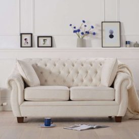 With classic soft scroll arms and button back detailing, this Liv Chesterfield-inspired 2 seater sofa offers timeless style perfect for any living room. Upholstered in smooth ivory coloured linen fabric, it blends beautifully with a variety of décors and looks fantastic on its own or when combined with other matching pieces. The sofa is complete with square-cut solid ash feet and comes with two 40 cm square cushions.