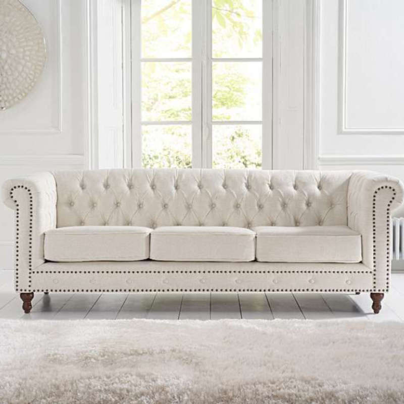 Elegant and making a statement, the Montrose 3 seater sofa features a beautiful neutral ivory shade, in a light and cool linen fabric. It boasts classic Chesterfield styling, with its deeply buttoned backrest and softly scrolled arms, modernised with contemporary metal studded trims. Wide foam-filled cushions make for a roomier seat for the whole family, with two free scatter cushions provided for style and comfort. Supported by low-rise, sturdy ash-toned oak legs.