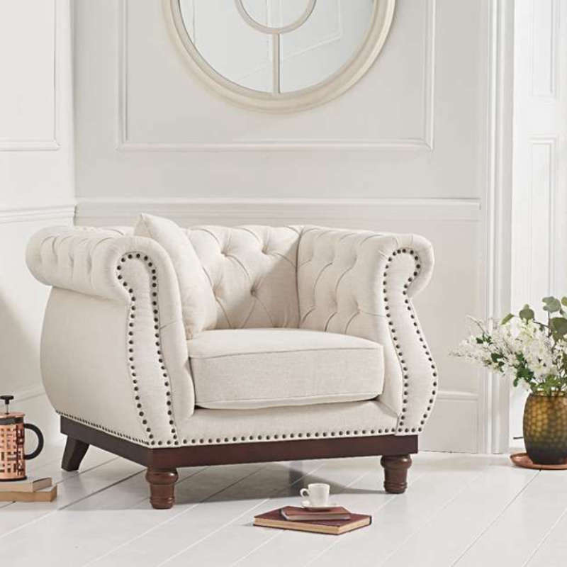 Upholstered in a light ivory linen, the stylish Highgrove armchair features charming Chesterfield design elements with its statement scrolled arms and deeply buttoned and tufted backrest, as well as a unique and modern tonal metal studded trim. Marrying cosy comfort, style and durability, it boasts plump and deep foam-filled cushioned seats for the ultimate in chic lounging, and a sturdy ash-toned base and low legs.