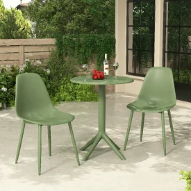 Infused with an organic, moss‑green hue, this Cala bistro set brings a soothing touch of nature to your patio. The round table features a slatted top design that echoes the sculpted seat backs of the accompanying chairs, creating a cohesive look that feels both contemporary and timeless. Crafted from lightweight yet durable materials, the set resists fading and wear, so you can enjoy its natural charm season after season.