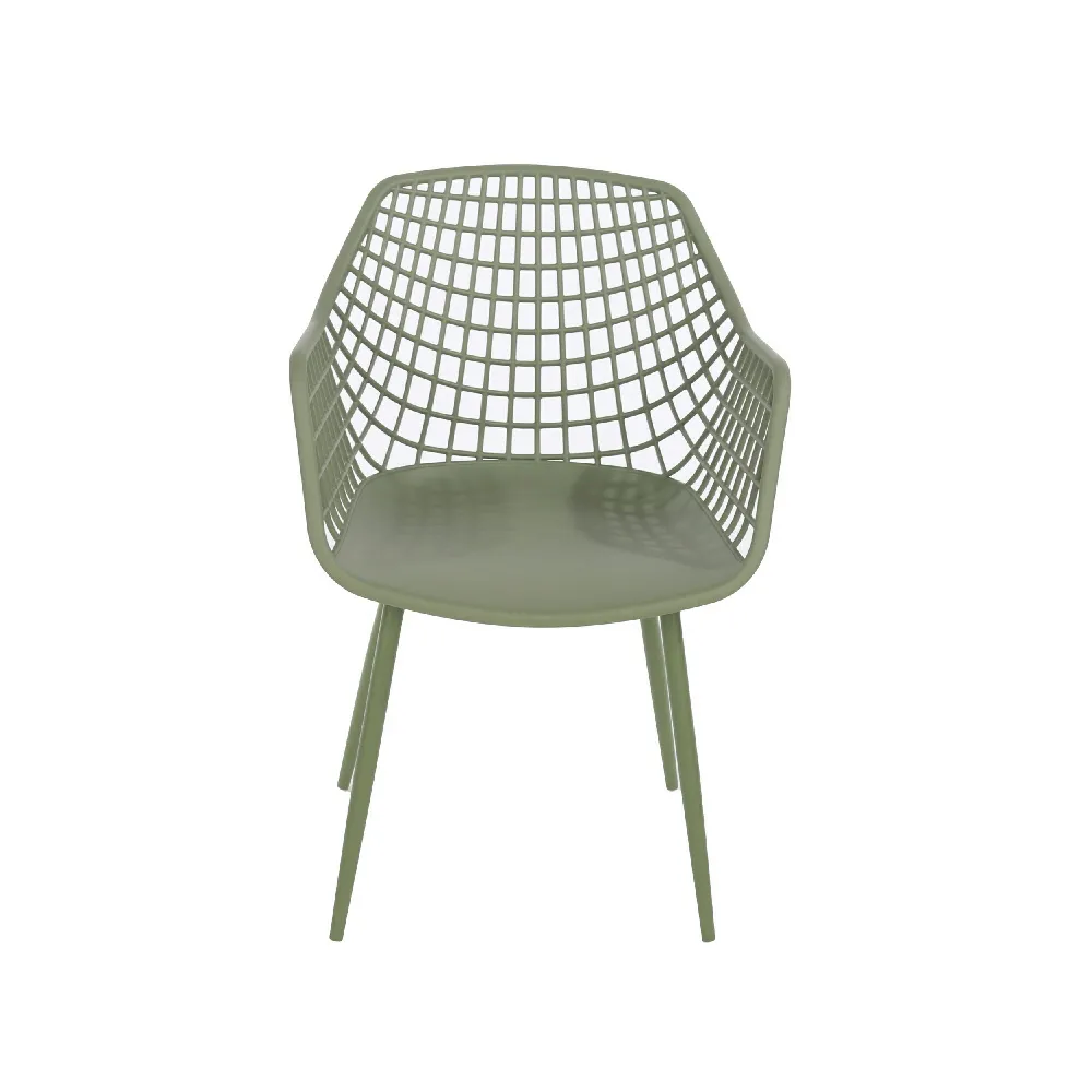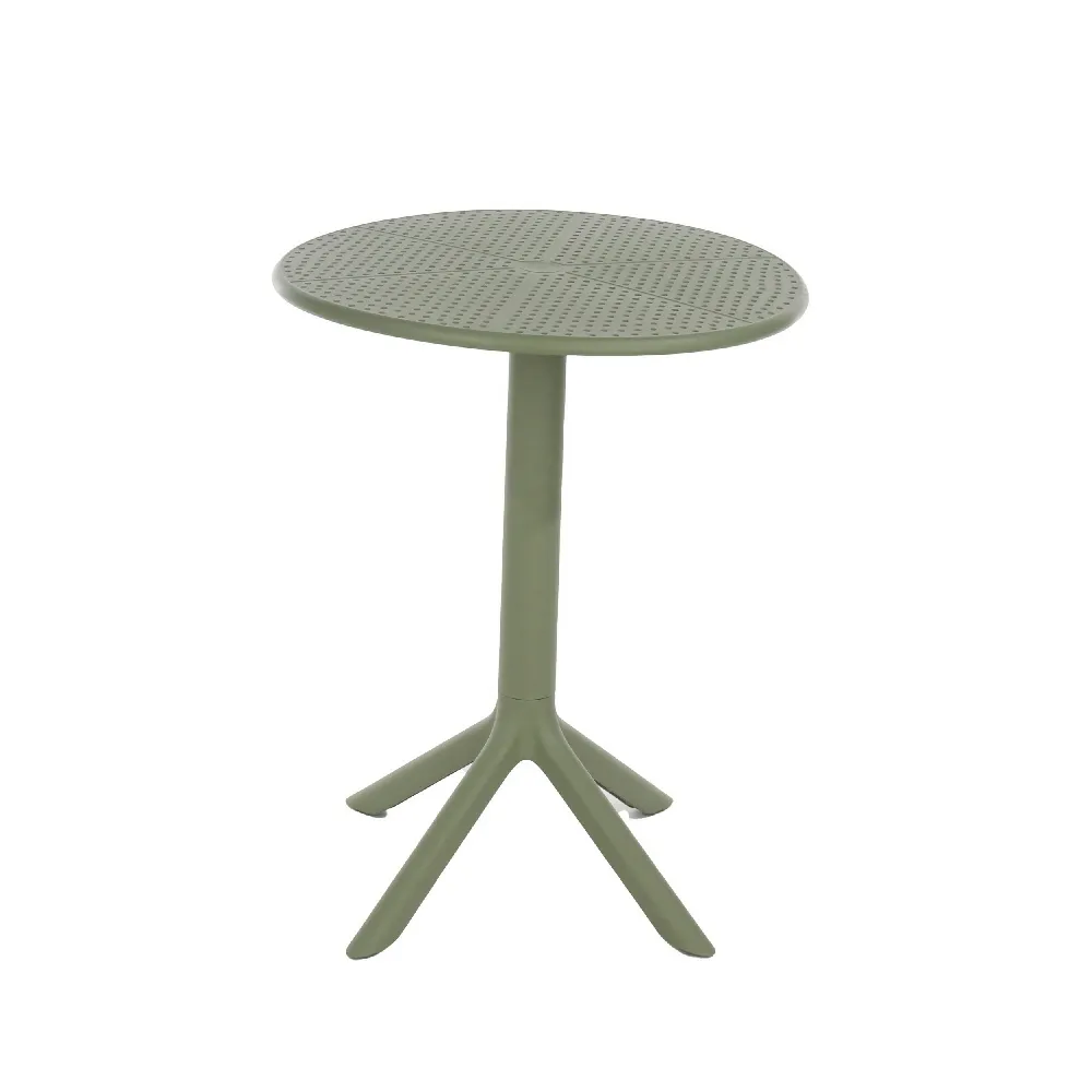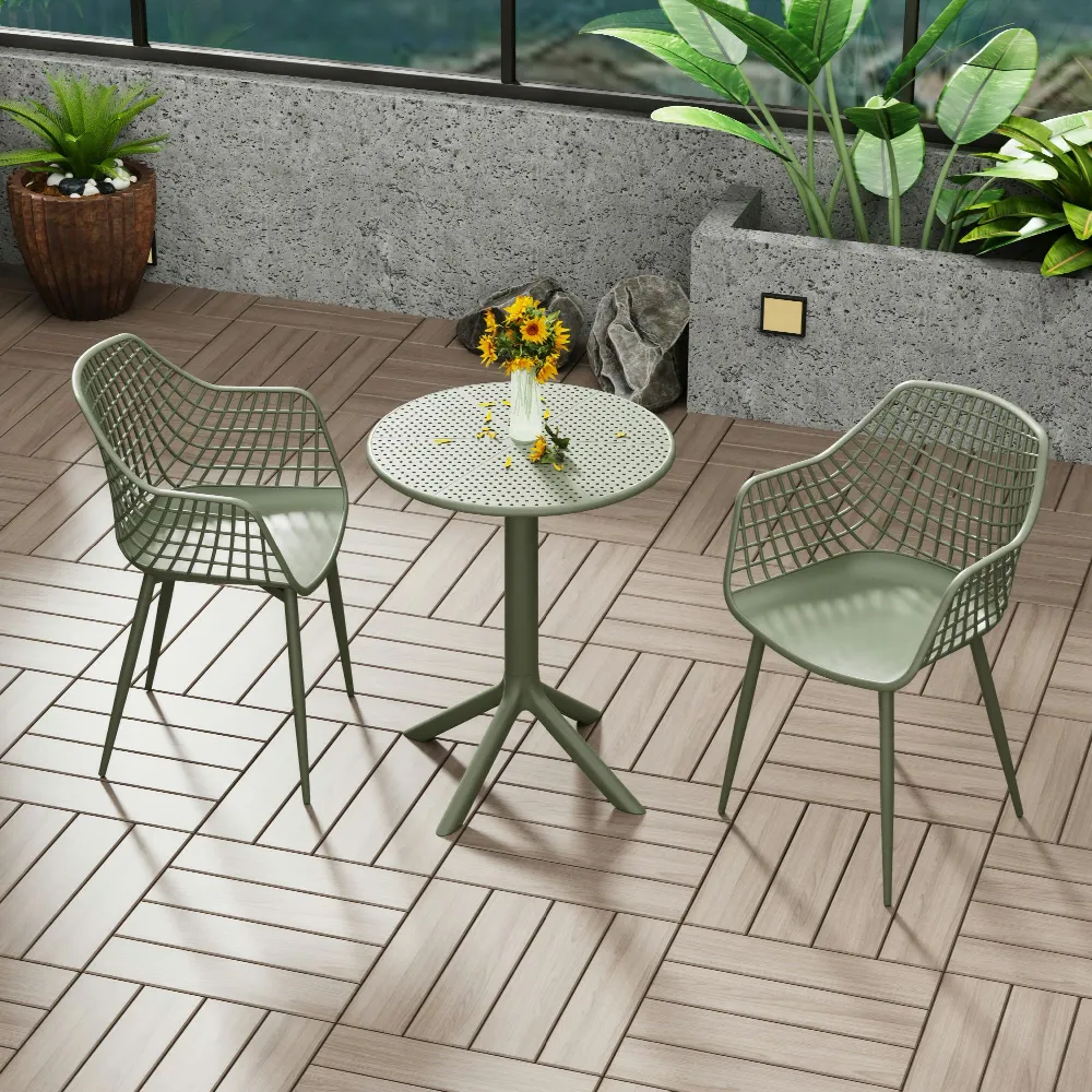 Bring an earthy, contemporary vibe to your patio with the Moss Green Lattice Bistro Set. Finished in an understated sage hue, this three‑piece ensemble seamlessly blends industrial metalwork with natural tones. The circular table has a perforated lattice top that complements the openwork backs of the chairs, allowing sunlight and rain to pass through with ease. Subtle curved lines and angled legs give the set a modern yet timeless profile.