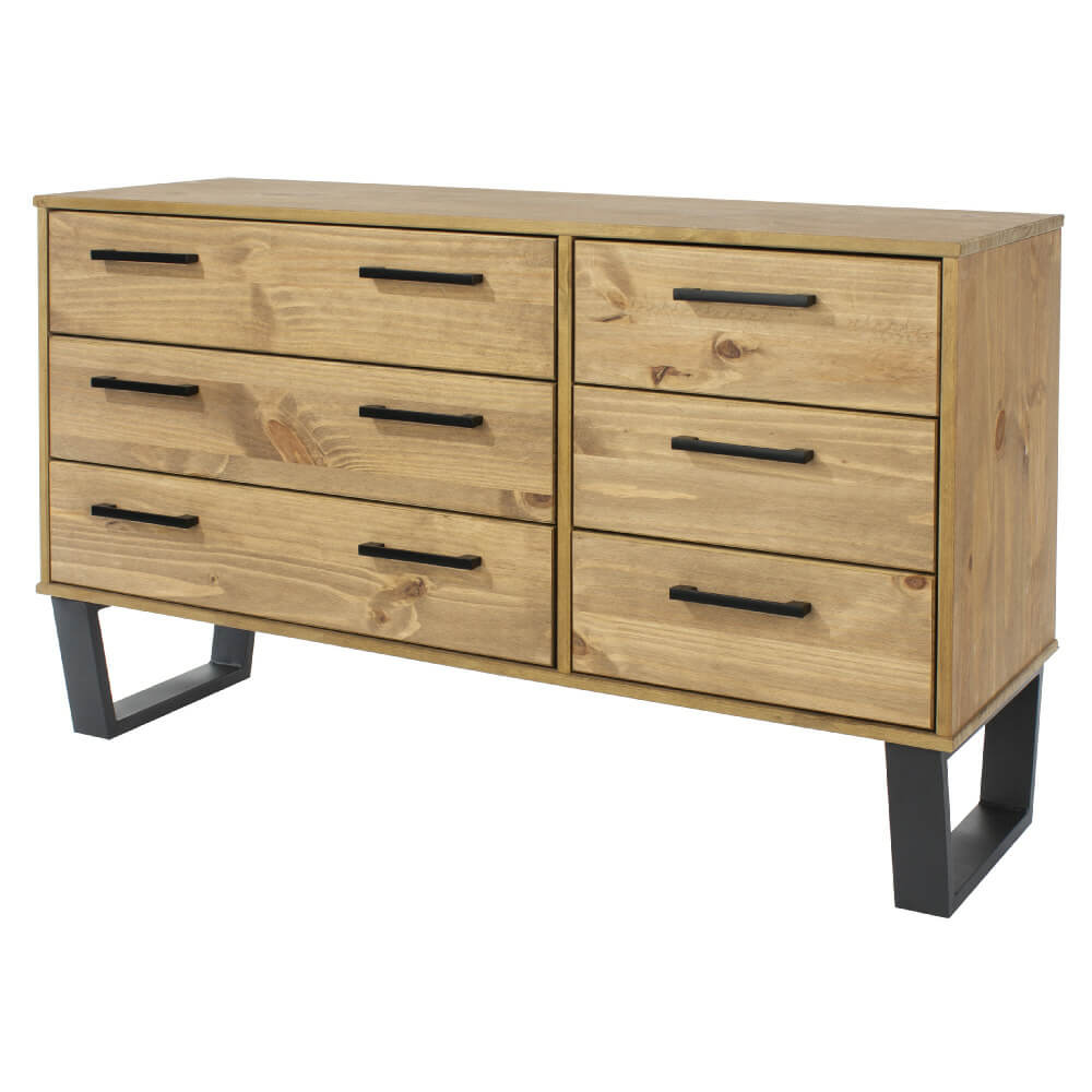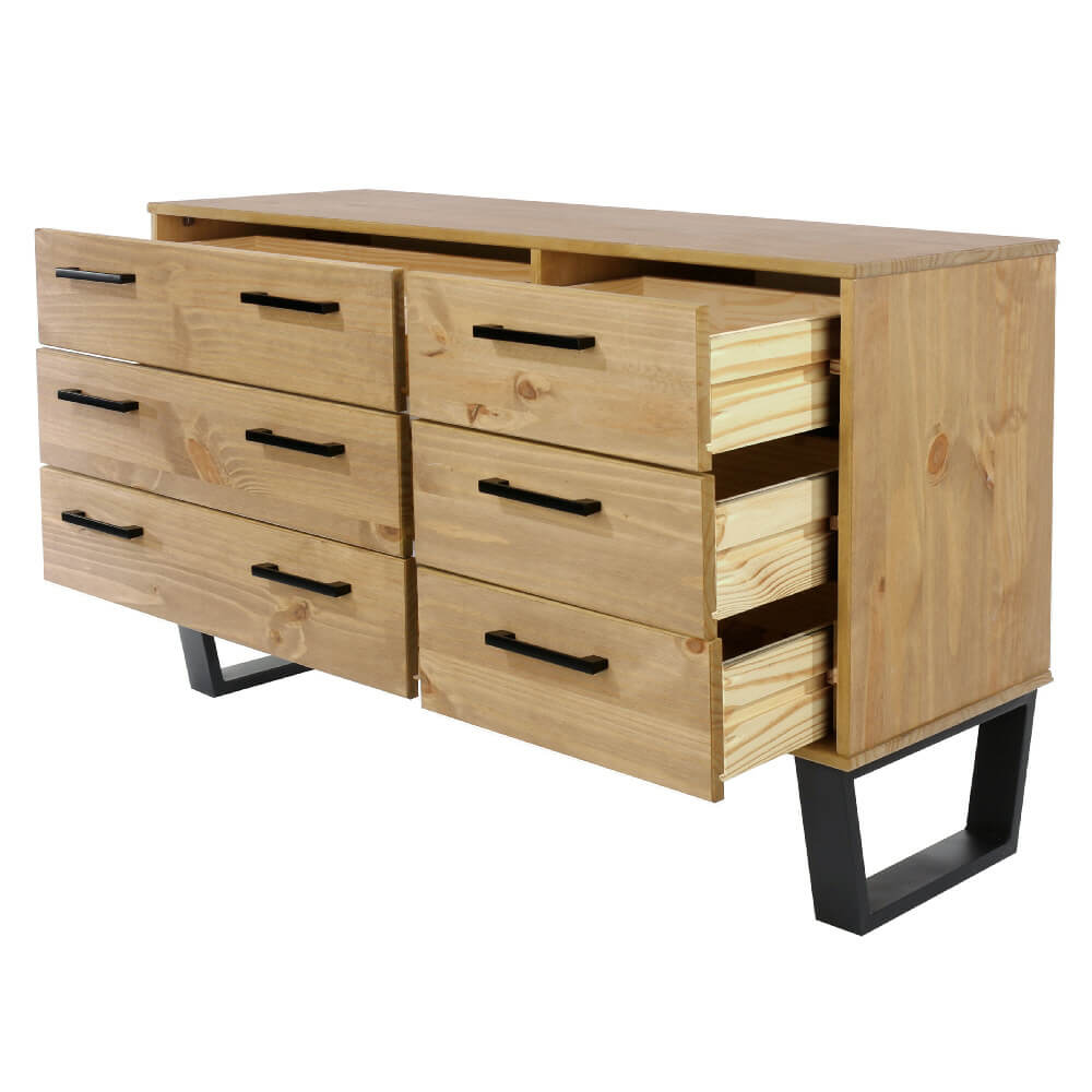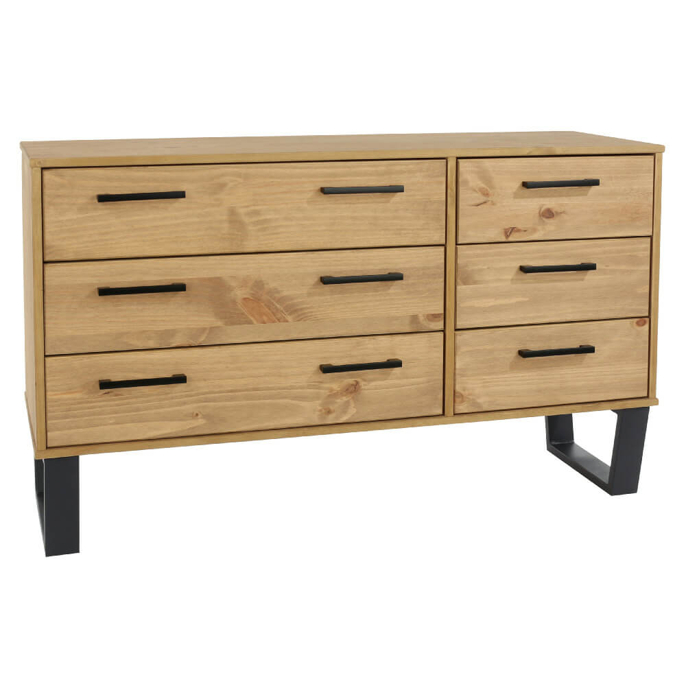 Our Texas wide industrial look chest gives you 3 wide and 3 narrow drawers in one large unit. Manufactured from real wood that has an attractive antique waxed finish, with handles and distinctive legs in black metal. Also available in a grey waxed finish.
