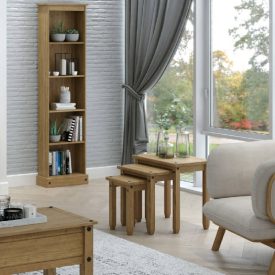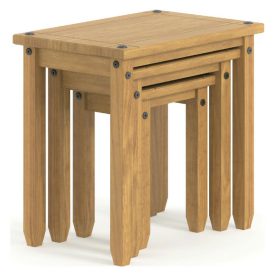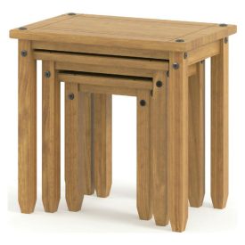 A nest of tables from our Corona range. So, antique waxed pine (which darkens the colour a bit) scalloped legs and faux bolt heads. The fake bolt heads are added during assembly, so you can leave them off if you prefer. There are no pilot holes so no one will know they’re missing.