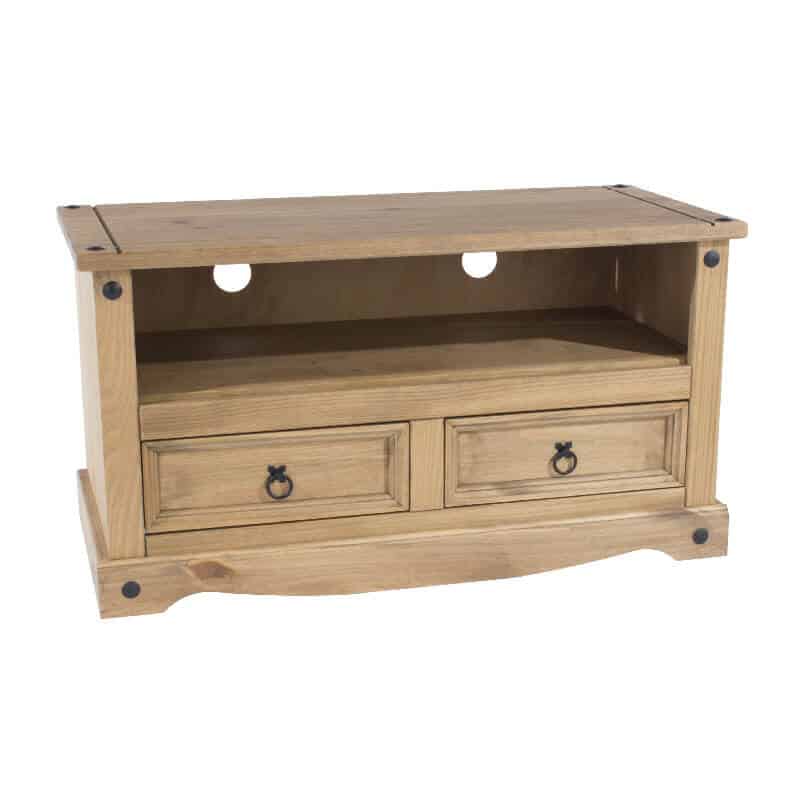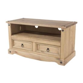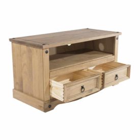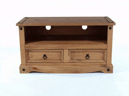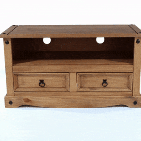 A low, twin door TV unit with closed shelf and pattern cut top. This is from our traditional Corona Pine range, so black ironmongery and wax treated pine are the order of the day. It has large cut outs in the rear panel for cable management. Drop pull handles and corner studs complete the look.