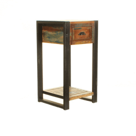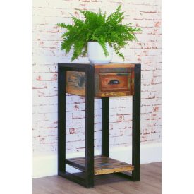 Introducing our unique and contemporary one-drawer plant stand/lamp table, a stunning piece from our exclusive Urban Chic range. It is crafted using reclaimed wood salvaged from places such as Gujarat, Maharashtra, and Rajasthan in Southern India, making it an environmentally friendly choice.