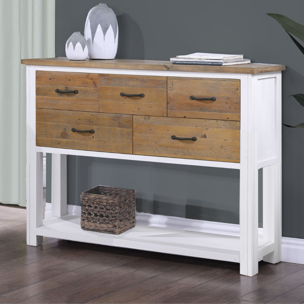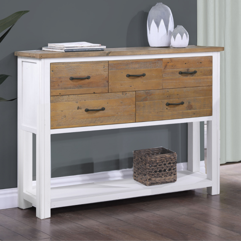 Meet our Splash of White Sideboard or Console Table, the unsung hero of the furniture world. It’s not just a table, it’s a statement. This little gem is the perfect blend of style and practicality, designed to bring a fresh, clean look to any room. Made from sturdy, high-quality materials, this sideboard is built to last. It’s like the Bruce Willis of furniture – tough, reliable, and looks great in white. It features a spacious top surface, perfect for displaying your prized possessions or, you know, a nice vase of flowers. Plus, it comes with five generous drawers for all those bits and bobs you’d rather keep out of sight