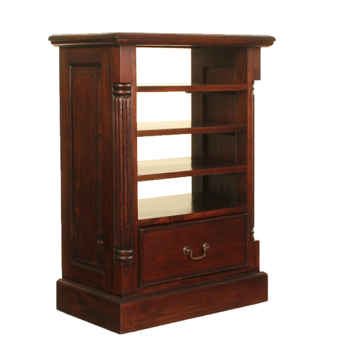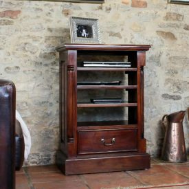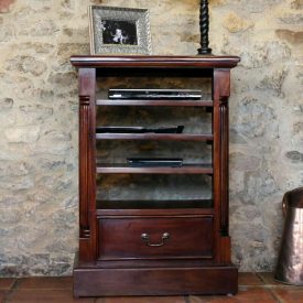 We’re calling this a TV unit, even though it doesn’t actually hold the TV, just the accessories for it. It’s specifically for wall-mounted televisions, so you can place this directly below it and run any cables straight down into it. There’s 4 open-backed shelves, each large enough to hold a single box or player, and a drawer at the bottom for everything else. It’s from our La Roque range, so solid mahogany throughout, finished with a mid gloss (not too shiny, not too dull) lacquer. There’s a classic fluted and panel design, and an antiqued brass bow drop handle on the drawer, no plastic here.