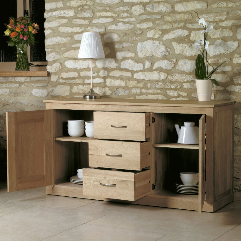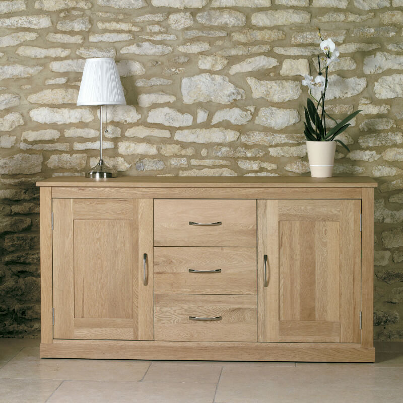 An exceptional, contemporary oak sideboard built using superb craftsmanship. It features two large outer cupboards with height-adjustable and removable shelves, as well as three spacious drawers. This furniture is crafted from the highest quality solid oak, with no veneers, and boasts a hardwood back and drawer inners. The panelled sides and beautifully constructed tongue and groove back add design detail, while the dovetailed drawer joints and stylish brushed steel two-tone handles are both functional and stylish.
