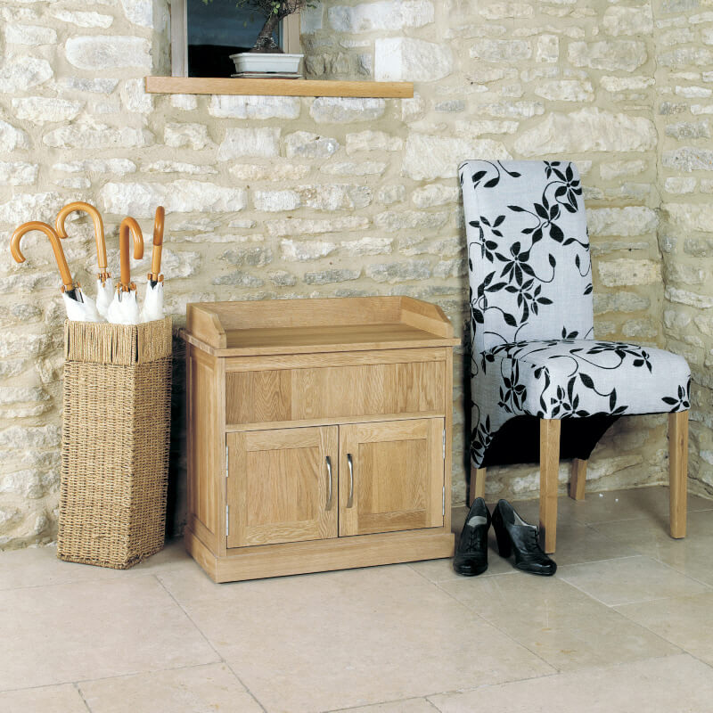 This is a contemporary oak shoe storage bench that offers both seating and storage solutions for your hallway. The bench top offers a comfortable and practical place to sit while putting on your shoes, and its size fits nicely in most hallways without taking up too much room. The bottom of this shoe bench is a cupboard designed to keep your shoes neatly hidden, while the bench seat lifts up to provide extra storage for hats, scarves, sunglasses, gloves, keys, and other small items. The hydraulic damper helps prevent little fingers from being trapped.