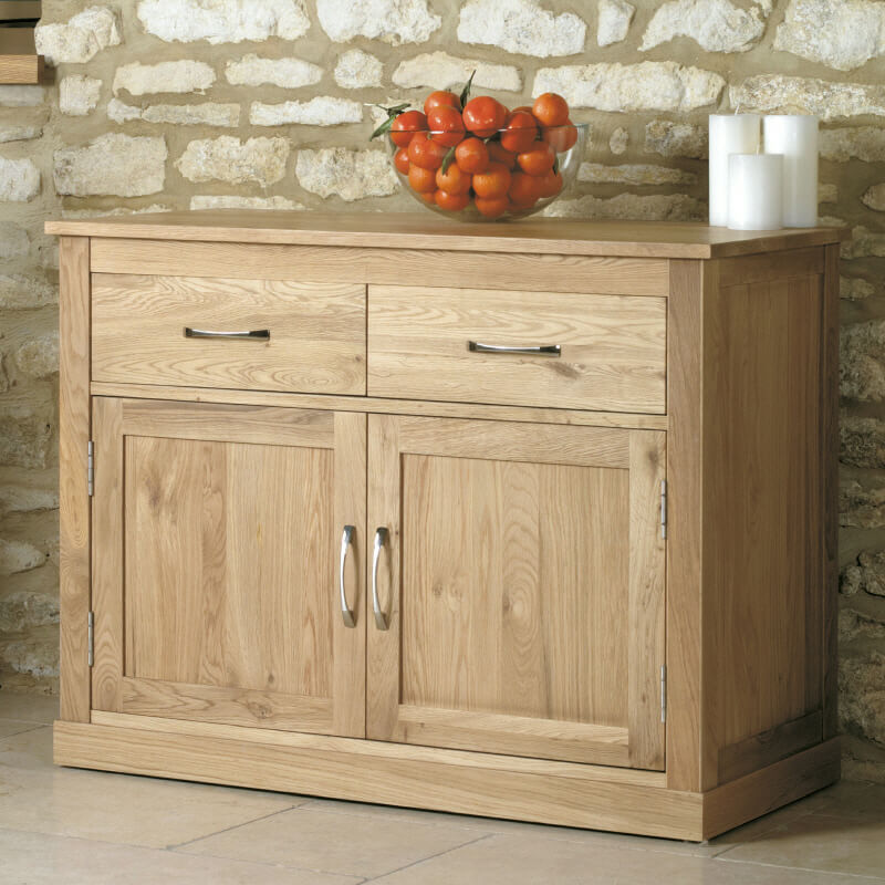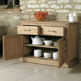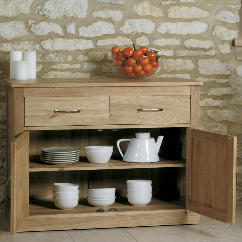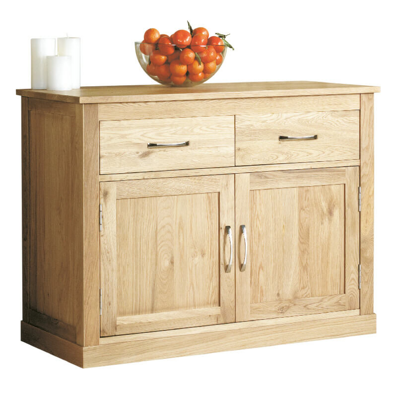 This small oak sideboard has a contemporary design. It includes a large cupboard with a shelf that can be adjusted to three different heights for flexible storage. The full-width shelf can also be removed to create a full-height cupboard if desired. There are also two spacious drawers for additional storage. This sideboard can be paired with other pieces from the Mobel Oak range. Crafted from high-quality solid oak, this piece is built to last a lifetime. It features a hardwood tongue and groove panelled back and panelled sides for added design detail. The satin lacquer finish is both hard-wearing and showcases the natural grain of the wood. This furniture is solidly constructed and requires no assembly.
