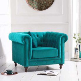 Our Montrose armchair brings classic style and ultimate comfort to your living room. Upholstered in sumptuous teal plush fabric, the armchair boasts a number of Chesterfield design elements including elegant scrolled armrests and deep buttoning on the backrest. Featuring metal stud detailing around the edges, it has a deep filled foam seat cushion for a comfortable sit and is complete with ornate solid wood feet. Comes with a free scatter cushion.
