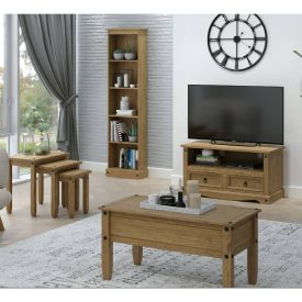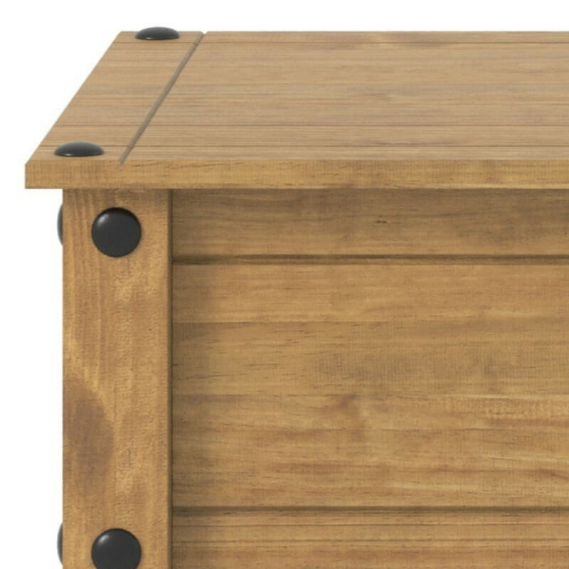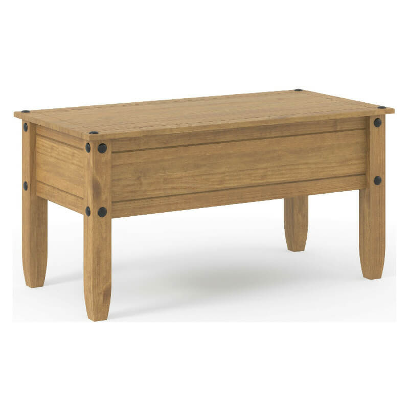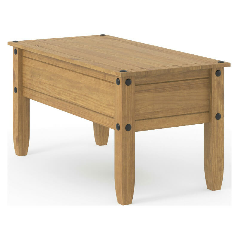 Here’s a quaint little coffee table from our Corona waxed pine range, ideal as a centrepiece with a few magazines lying on it. With its (optional, can be left off) faux bolt heads and grooved surfaces, this looks anything but brand new flat pack.