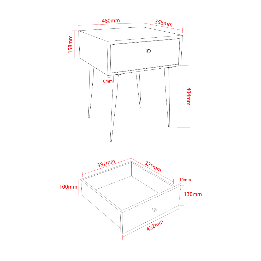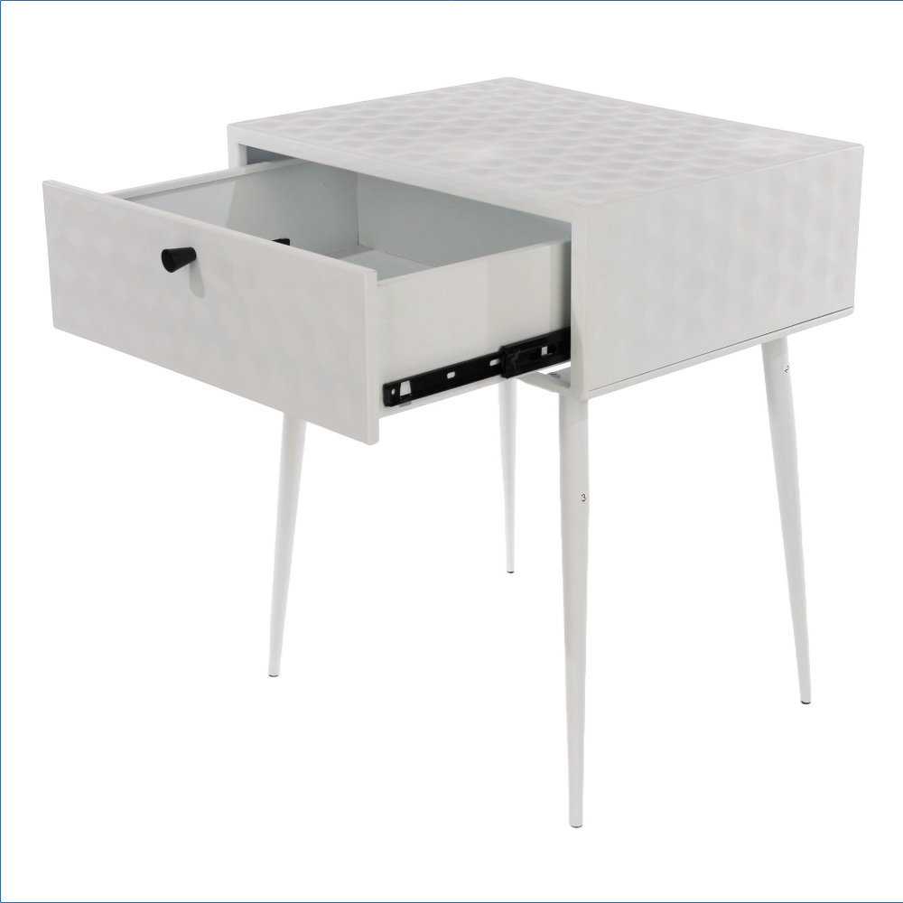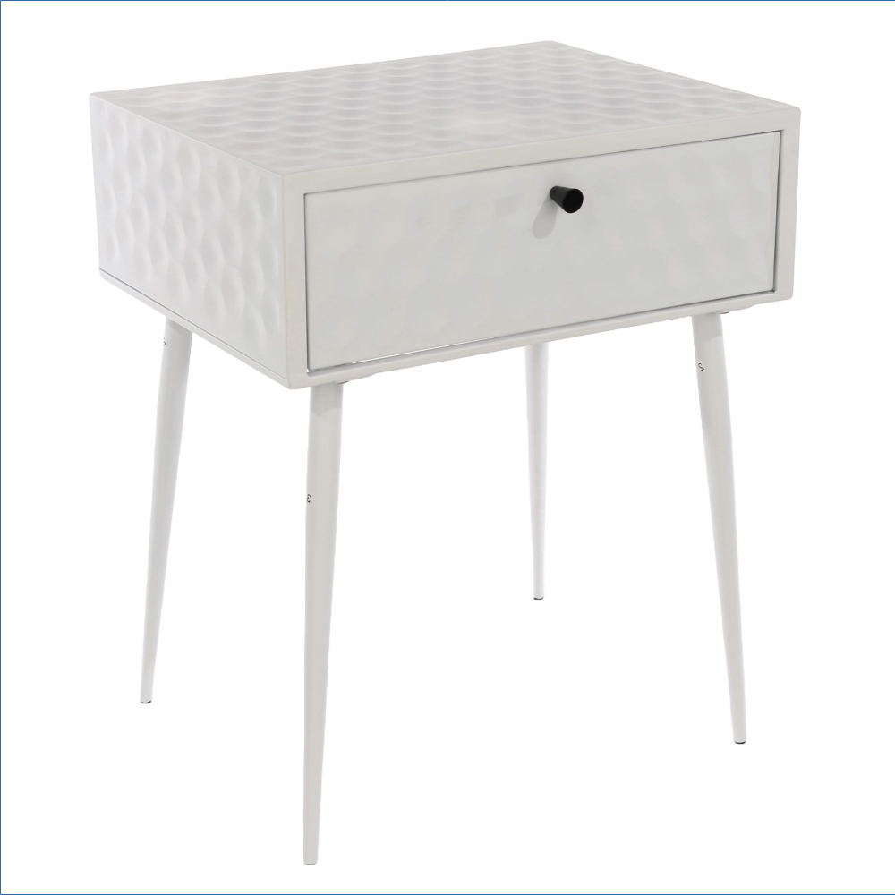 Durable, robust, and elegant. This bedside cabinet is crafted entirely from metal and finished in sleek white paint, highlighted by a contrasting gold-effect handle. The drawer features a pressed honeycomb pattern that adds a striking three-dimensional texture to the panels and front, complemented by the gold-colored handle. Inside, the drawer box is also metal with a painted finish and smooth-glide metal runners for effortless use. The design is finished with Mid-Century inspired tapered metal legs that raise the cabinet for easy cleaning underneath, making it perfect as a bedside or side table.