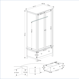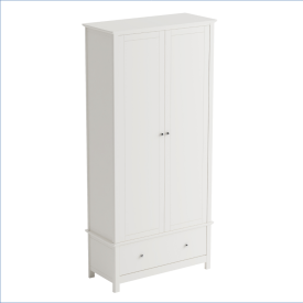 Maximise your bedroom storage with this charming Nairn wardrobe, featuring 2 doors and 1 drawer. Crafted to make the most of your space while offering generous storage, it includes a metal hanging rail behind the two moulded panel doors, perfect for suits, shirts, and dresses. Below, a spacious full-width drawer provides additional practical storage. The wardrobe’s subtle deep white painted finish highlights the gently rounded corners on the legs, top, and door mouldings, complemented by sleek, polished steel-effect metal handles. Together, these details create a serene and inviting atmosphere in your bedroom.