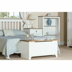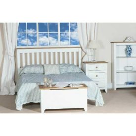 Here’s our Capri bed, in matt white with a subtle yet noticeable antique-waxed pine top rail on the headboard that sets it off beautifully. The headboard sits high enough that you can still see the bottom rail of the design with the mattress in place. Solidly made as you can see, this no-nonsense design is easy to assemble and strong enough to last for many years.