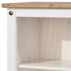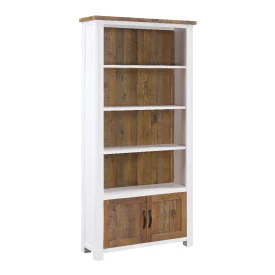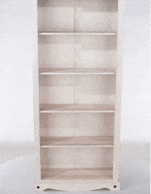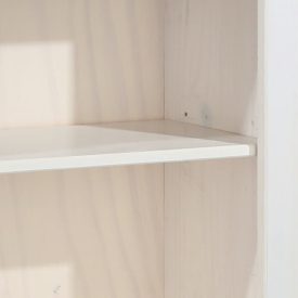 This is a large bookcase, with 4 well-spaced shelves to hold a whole family’s worth of reading material, 3 of the shelves are height-adjustable just by moving some pins. In sturdy pine with a white washed finish, it’s your choice whether or not to add the brass corner studs. The top is waxed pine, and even if you can only see the edges of it, it still adds a little something to the overall look of the bookcase. A wall strap is included for peace of mind if you have children in the house, and so is some touch up paint, also in case you have children in the house.